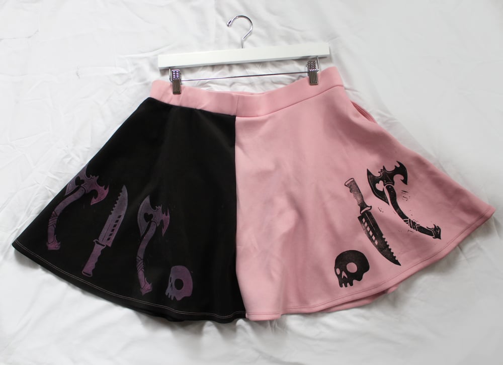 Two tone skirt with hand printed details. Has minor wear from previous owner. Size XL.